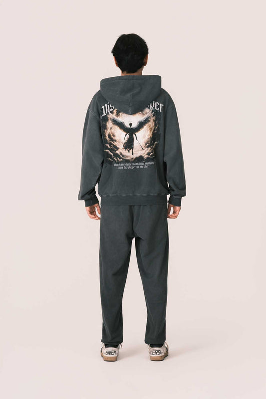 In offertaSTONE WASH BLACK HOODIE WITH ANGEL PRINT